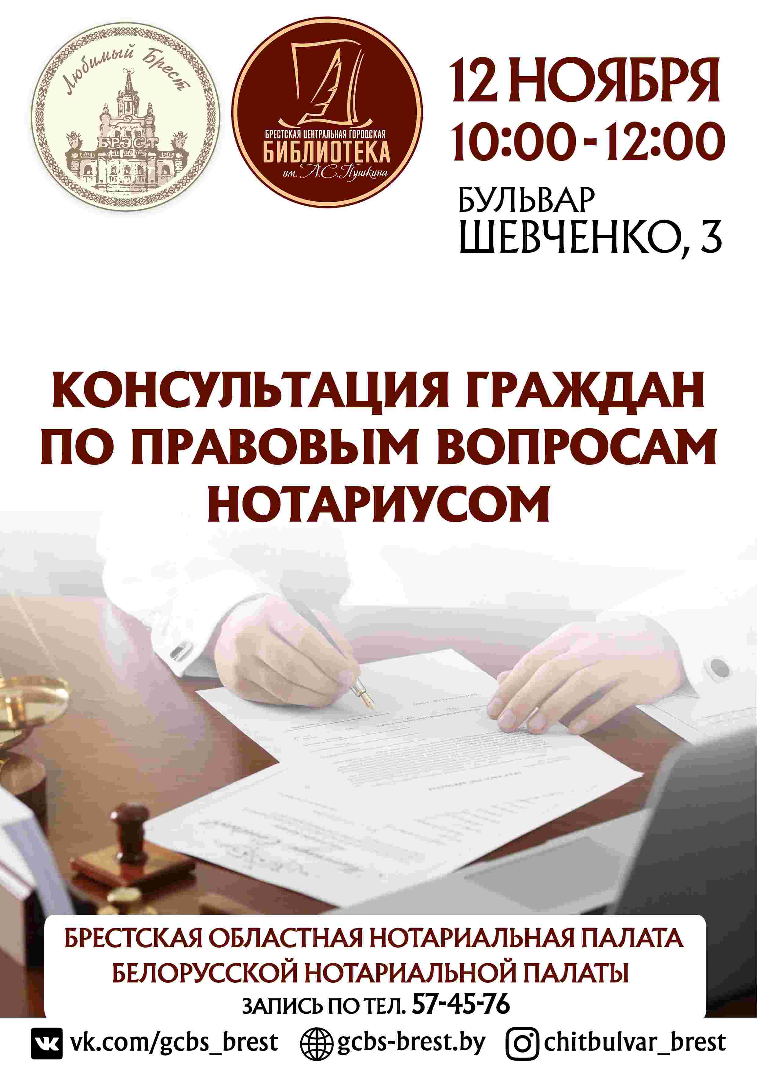Выставка живописи Нилы Горчанюк «Вершины» открылась 22 октября в «Арт-пространстве библиотеки». Выставка продлится до 30 ноября. 4 ноября (первый вторник месяца) в 18.00 в Центральной городской библиотеке им. А.С.Пушкина пройдёт заседание книжного клуба «На Читающем бульваре». Целый месяц мы самостоятельно читаем, анализируем и разбираем роман Джека Лондона «Маленькая хозяйка большого дома» для себя. А встретимся, чтобы обсудить роман совместно. Будем делиться впечатлениями, зачитывать цитаты и заметки, спорить и искать истину. Центральная городская библиотека им. А.С. Пушкина г. Бреста предлагает современную коворкинг-площадку на базе читального зала с бесплатным Wi-Fi. https://mchs.gov.by/edinyy-den-bezopasnosti/ Прэзентацыя кнігі Васіля Барысюка «Імгненне і працяг» адбудзецца 19 лістапада ў Цэнтральнай гарадской бібліятэцы імя Пушкіна. 12 ноября с 10.00 до 12.00 Брестская областная нотариальная палата в читальном зале Центральной городской библиотеки им. А.С. Пушкина проводит БЕСПЛАТНОЕ консультирование граждан по правовым вопросам нотариусом. Предварительная запись по телефону: 57-45-76.