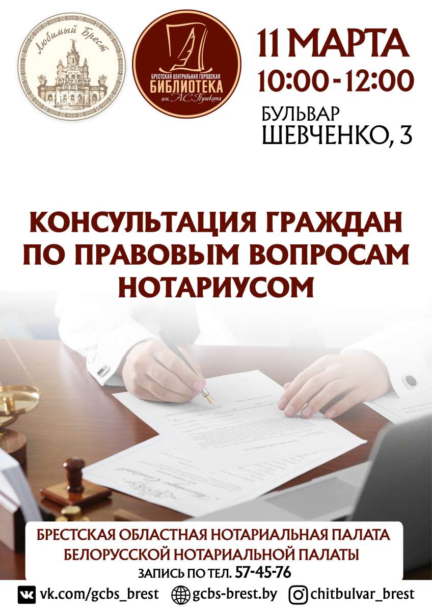 11 марта с 10.00 до 12.00 Брестская областная нотариальная палата на базе читального зала центральной городской библиотеки им. А.С.Пушкина проводит БЕСПЛАТНОЕ консультирование граждан по правовым вопросам нотариусом.