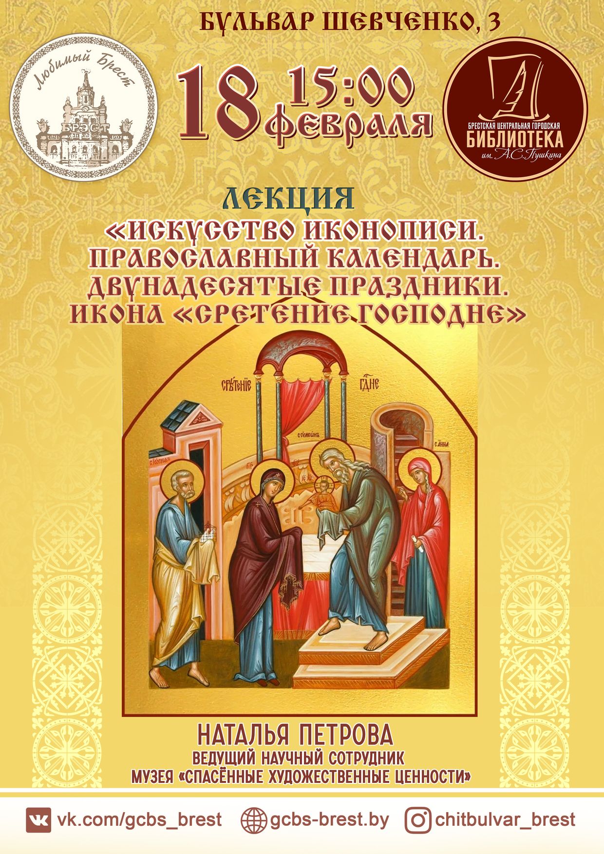 Икона «Сретение Господне» – тема лекции, которая состоится 18 февраля в конференц-зале библиотеки им. А. С. Пушкина.
