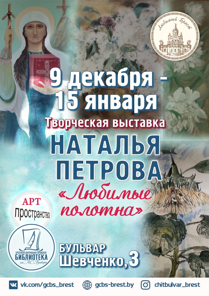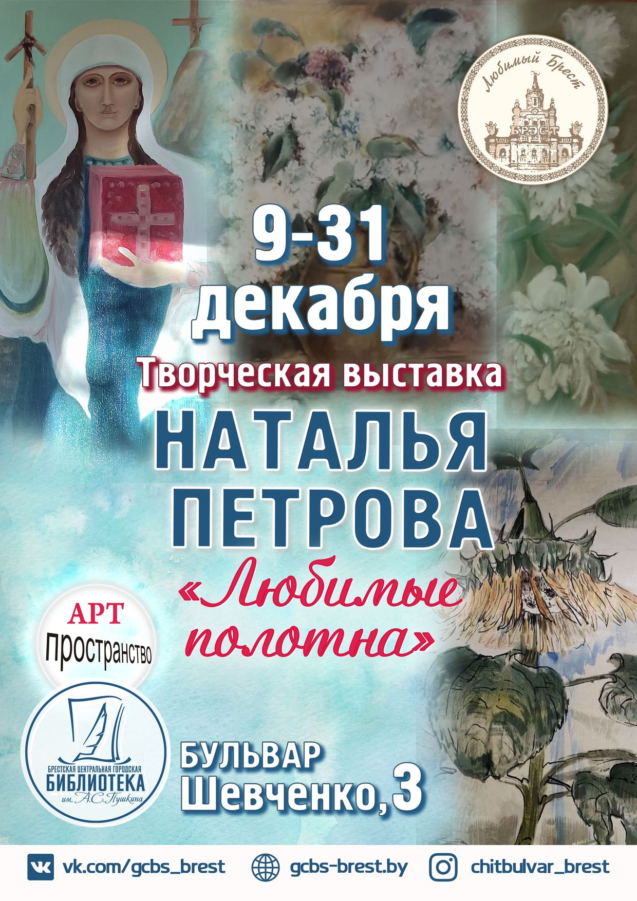 Более двадцати работ презентовала Наталья Петрова в экспозиции «Любимые полотна» в «Арт-пространстве библиотеки». Работы выполнены в различных техниках: батик, темпера, масляная живопись, графика, акрил, акварель. Цветы, натюрморты, картины православной тематики за 30 лет творческой деятельности художника представлены в уютном зале библиотеки.