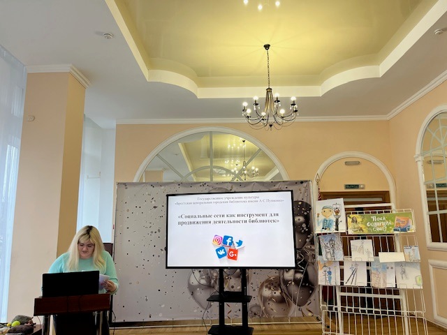 Анастасия Викторовна Мишковец, библиотекарь отдела маркетинга и социокультурной деятельности, поделилась опытом работы в соцсетях (Instagram, ВКонтакте и Facebook) по продвижению библиотечной деятельности. Анастасия Викторовна подробно остановилась на возможностях социальных сетей как инструменте для рекламы услуг, выставок и мероприятий, помогающем в привлечении новых пользователей.