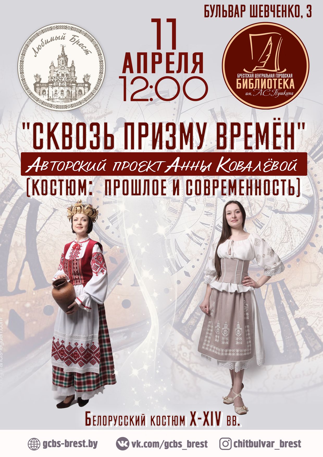 11 апреля в 12.00 в конференц-зале центральной городской библиотеки им. А.С. Пушкина Анна Ковалева представит второе мероприятие в рамках авторского проекта «Сквозь призму времён» (костюм: прошлое и современность), посвященное истории белорусского костюма X-XIV вв.