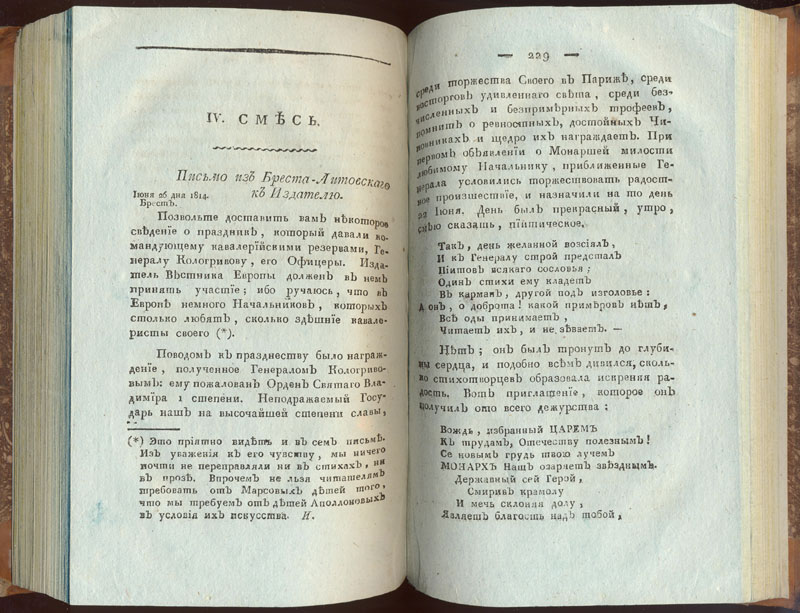 Грибоедов описывает состоявшийся в Бресте 22 июня праздник – отмечалось окончание войны и награждение генерала Кологривова орденом Владимира I степени. В этот день стихи поистине лились рекой. Каждый хотел приветствовать любимого начальника поэтически. Описывая место праздника, происходившего в версте от города, «на даче, где генерал имеет обыкновенное пребывание», он обращается к истории Бреста: