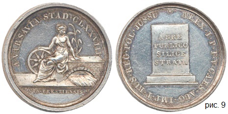В честь окончания строительства шоссейной дороги Варшава – Брест (1822) в 1823 г. было выпущено две медали, одна из них – на рисунке 9. В 1825 г. в честь этого же события в Варшаве на ул.Гроховской построили обелиск высотой 14 метров (рисунок 10), который сохранился до сих пор.