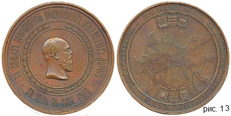 Со строительством и развитием сети железных дорог в западной части Российской империи Брест-Литовск приобретает еще большее значение. В 1866–1867 гг. была построена железная дорога (российского широкого стандарта) Варшава – Тересполь, в 1871 г. ее соединили с Брестом. Одновременно шло стоительство железных дорог Москва – Смоленск и Смоленск – Брест. После многолетних обсуждений был выбран кратчайший маршрут через Оршу и Минск. Благодаря этому 23 августа 1870 г. было торжественно начато строительство Минской железнодорожной станции 2-го класса, а 16 ноября 1871 г. открыто движение поездов по Смоленско-Брестской железной дороге. В 1883–1887 гг. после завершения строительства Полесских железных дорог Брест-Литовск оказался на пересечении нескольких железнодорожных веток, а в честь этого события на Санкт-Петербургском монетном дворе была отчеканена памятная медаль (рисунок 13).