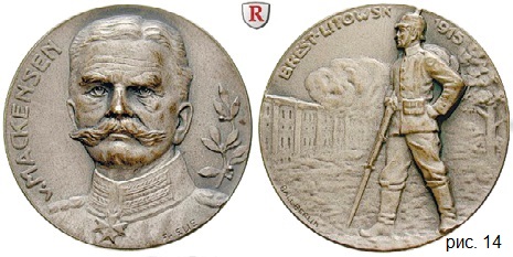 Война 1914–1918 гг. и история Брест-Литовска отражены сразу в нескольких медалях. Несмотря на усиленную подготовку к обороне, которой руководил комендант крепости генерал от артиллерии В.А. Лайминг, после осложнившейся ситуации на фронте в 1915 г. и возможного использования немцами отравляющих газов (что произошло при обороне крепостей Ново-Георгиевск и Ковно), было принято решение оставить крепость без боя, предварительно взорвав большинство укреплений. Мосты и часть города были сожжены, необходимые вооружения и боеприпасы вывезены. В ночь с 12 на 13 августа (по старому стилю) 1915 г. русские войска покинули крепость и город. Немецкие и австрийские войска, обойдя крепость севернее и южнее, утром 26 августа 1915 г. (по новому стилю) заняли Брест-Литовск. Несмотря на то, что город и крепость были взяты без боя, в честь взятия Брест-Литовска и крепости в Германии была отчеканена памятная медаль (рисунок 14). На аверсе – изображение генерал-фельдмаршала Августа фон Макензена, под его общим командованием был занят Брест-Литовск; на реверсе – немецкий солдат на фоне горящего здания.