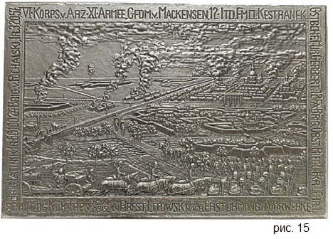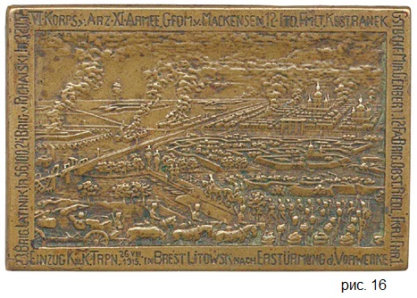 В Австрии в память взятия Брест-Литовска была изготовлена художественная плакетка «Вступление войск 26.08.1915 в Брест-Литовск после штурма» (рисунок 15) и миниатюрный нагрудный знак с заколкой по ее образцу (рисунок 16). На фоне панорамы пылающего города маршируют австрийские и немецкие войска. По периметру – названия австрийских и немецких воинских частей и их командиров, принявших участие в штурме. В левом верхнем углу подпись автора – J. Walach. Аналог художественной плакетки хранится в Военно-историческом музее Вены.