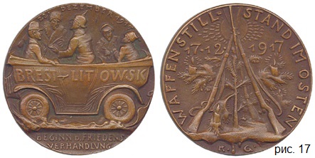 Брестский мир 1918 г. отражен в двух медалях. На медали 1917 г. «Перемирие на Востоке 17.12.1917» (рисунок 17), которое предшествовало заключению Брест-Литовского мира, в машине изображены сидящими главы всех делегаций, участвовавших в переговорах, второй человек справа (в фуражке) – Лев Троцкий, возглавлявший советскую делегацию на втором этапе переговоров.