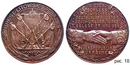 27 января (9 февраля по новому стилю) 1918 г. Центральные державы подписали сепаратный мирный договор с делегацией Украинской Центральной рады, в результате чего была провозглашена независимость Украины. В честь этого события в Германии была выпущена медаль (рисунок 18). После этого Брест-Литовск формально вошел в состав Украинской народной республики в качестве административного центра земли Подляшье, но ни одному украинскому правительству не удалось занять данные территории. 13 ноября 1918 г. на фоне революционных событий в Германии Брестский мир был аннулирован решением советского ВЦИК.