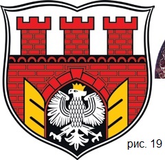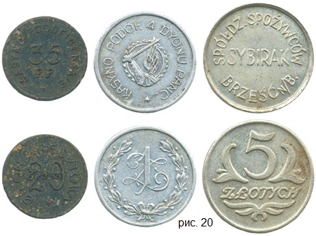 После советско-польской войны и Рижского мирного договора 1921 г. город под названием Брест-над-Бугом (переименован в 1923 г.) стал центром Полесского воеводства Польши, с 1921 г. по 1939 г. у города был герб, изображенный на рисунке 19. В Брестской крепости дислоцировалось много польских воинских частей, в которых для обеспечения военнослужащих различными товарами и услугами существовали военные кооперативы, где использовались свои металлические расчетные боны номиналами 5, 10, 20, 50 грошей и 1, 5 злотых. На рисунке 20 изображены металлические боны нескольких польских воинских частей, располагавшихся в гарнизоне Бреста: