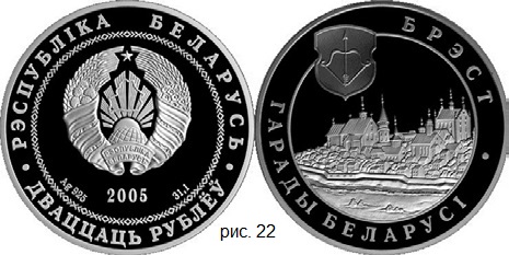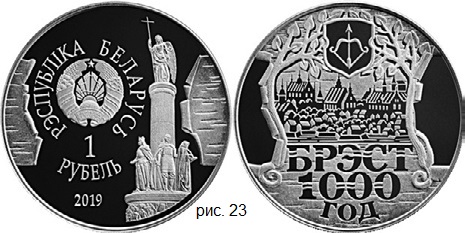 Город Брест также отражен в двух памятных монетах Беларуси. 8 декабря 2005 г. Национальный банк в серии «Города Беларуси» выпустил в обращение памятную монету «Брест» (художник С. Заскевич) номиналами 20 рублей (серебро) и 1 рубль (никель), тиражом по 2 000 экз. (рисунок 22). 5 апреля 2019 г. Национальный банк выпустил в обращение памятную монету «Брест. 1000 лет» (художник С. Некрасова) номиналами 20 рублей (серебро), тираж 1 200 экз. и 1 рубль (никель), тираж 4 000 экз. (рисунок 23).