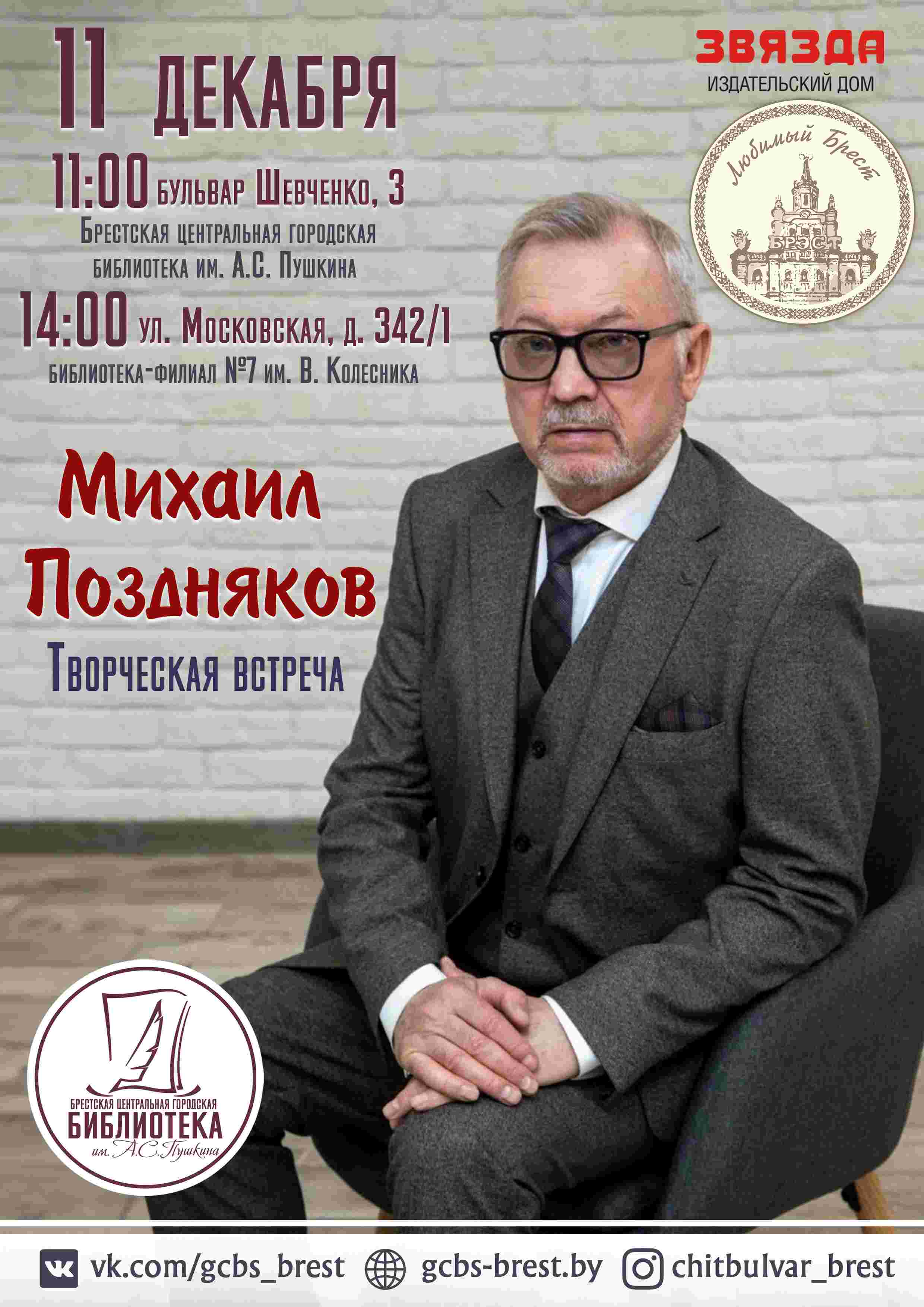 В рамках проекта «Кніжнае святло Звязды» в Брест приедет Михаил Павлович Поздняков - поэт, прозаик, переводчик, критик, языковед, публицист. Автор более восьмидесяти книг на белорусском и русском языках для юных и взрослых читателей.