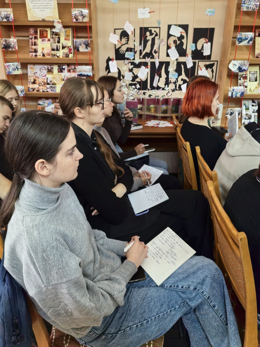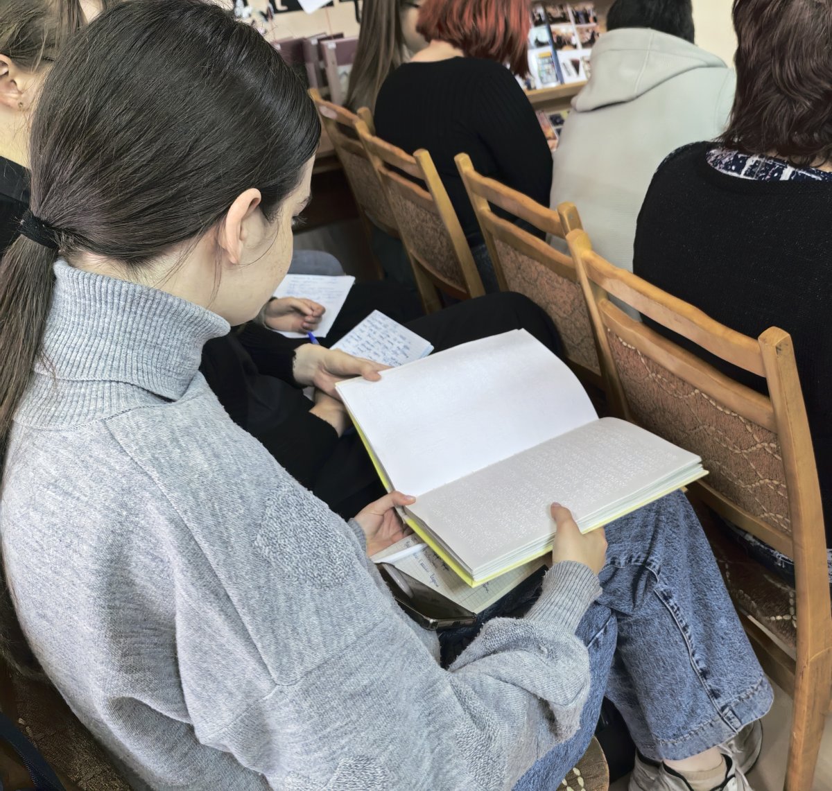 Студенты познакомились со спецификой работы специальной библиотеки и книгами, напечатанными рельефно-точечным шрифтом.
