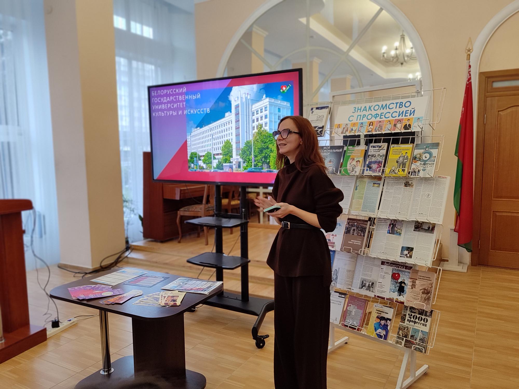 Профориентационная встреча с представителями Белорусского государственного университета культуры и искусств прошла в конференц-зале ЦГБ им. А.С. Пушкина. Гостями мероприятия стали Шелег Елена Александровна, преподаватель кафедры менеджмента социокультурной деятельности, и Анастасия, выпускница университета.
