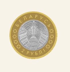 в центре – рельефное изображение Государственного герба Республики Беларусь; по кругу надписи: вверху – БЕЛАРУСЬ, внизу – 2 РУБЛI, между которыми – стилизованное изображение национального орнамента.