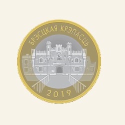 в центре – изображение Брестской крепости в г. Бресте, по кругу надписи: вверху – БРЭСЦКАЯ КРЭПАСЦЬ, внизу – 2019.