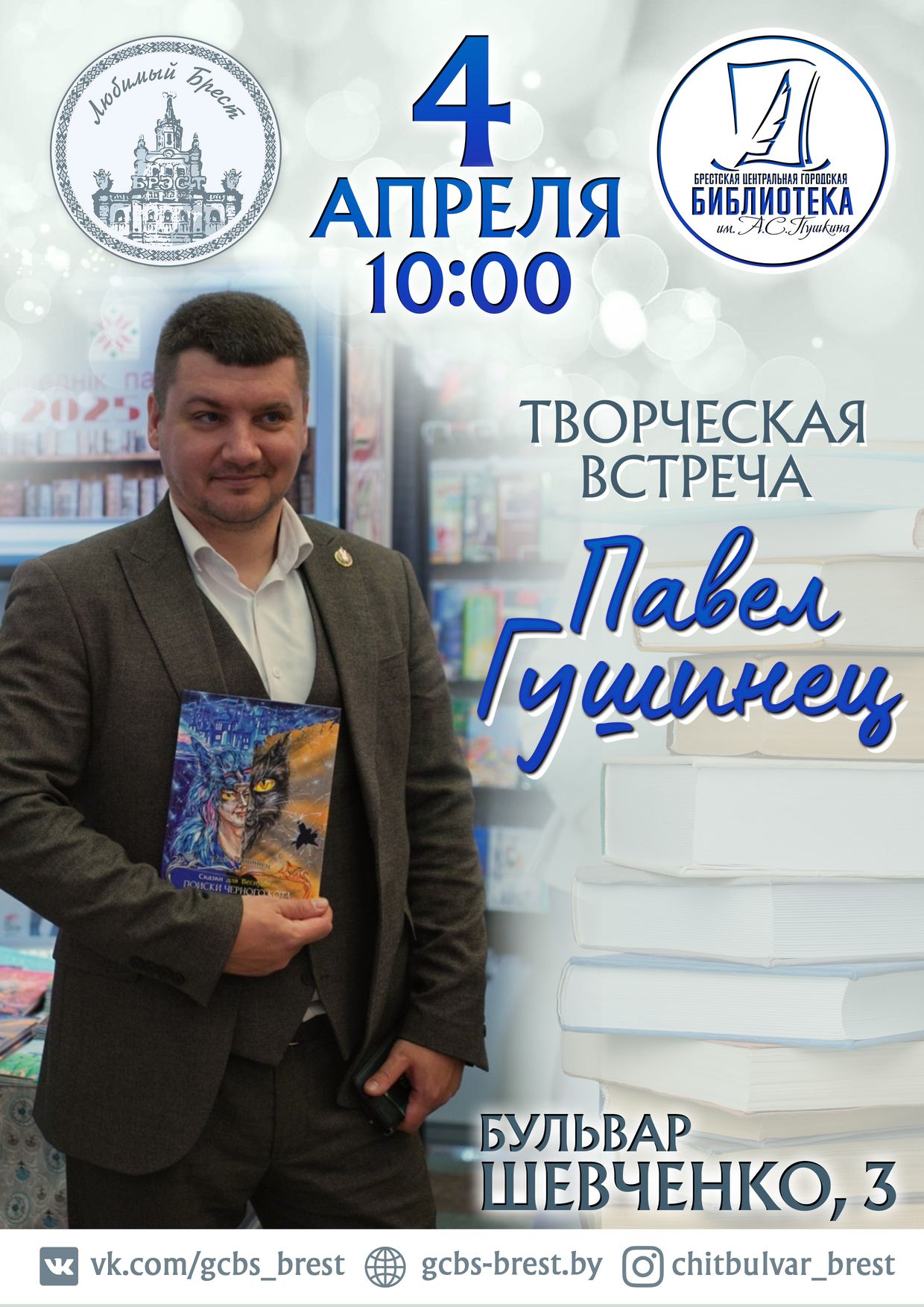 4 апреля в 10.00 в Брестской центральной городской библиотеке имени А.С.Пушкина состоится творческая встреча с популярным и самым позитивным белорусским писателем Павлом Гушинцом.
