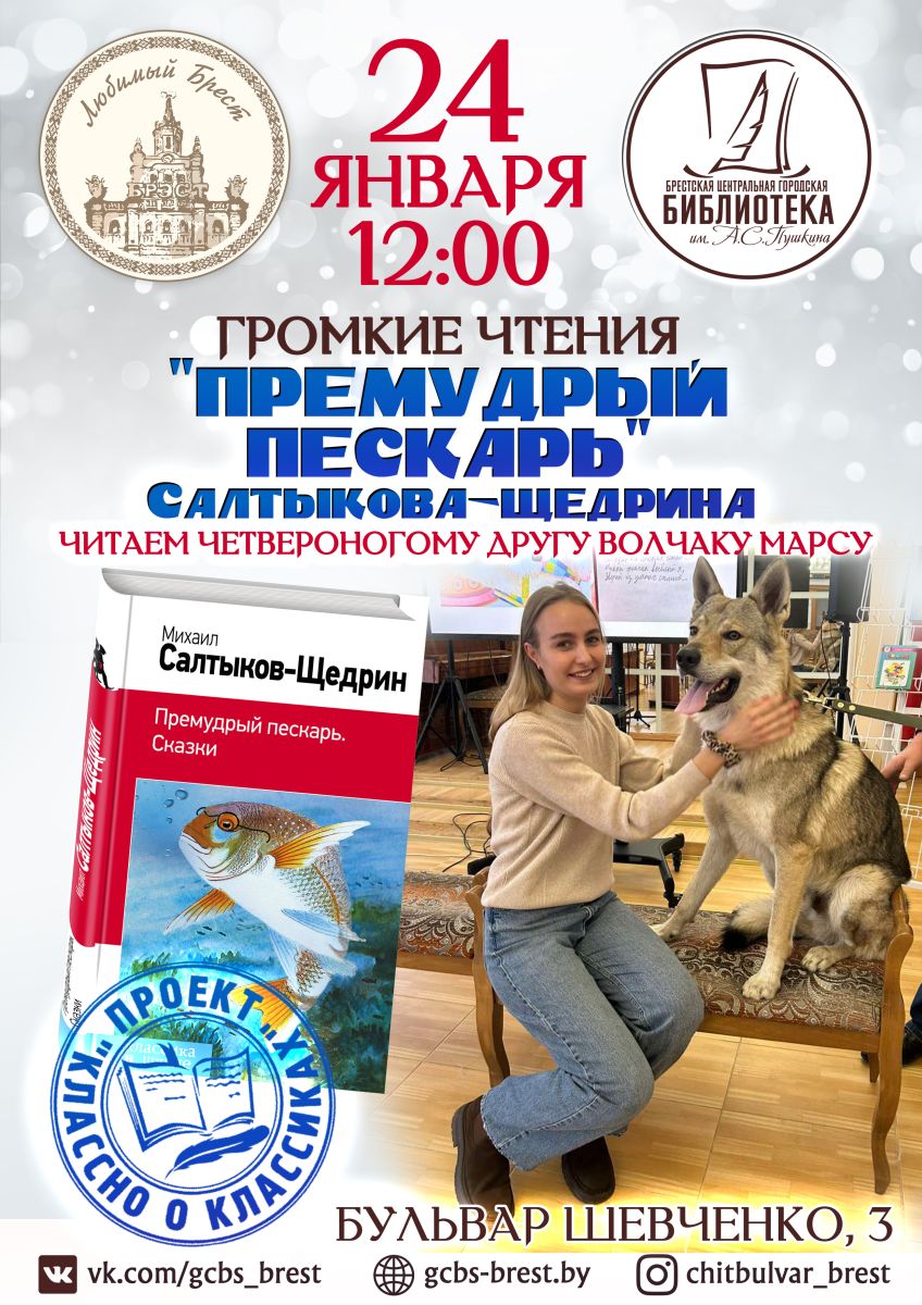 Брестская центральная городская библиотека имени А.С.Пушкина приглашает на очередную встречу в рамках проекта «Классно о классиках». 24 января в 12.00 пройдут громкие чтения замечательного произведения Салтыкова-Щедрина «Премудрый пескарь» с участием четвероногого друга –чехословацкого влчака Марса.